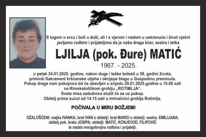 u petak 24.01.2025. godine, nakon duge i teške bolesti u 58. godini života, primivši Sakrament kršćanske utjehe i okrijepe blago u Gospodinu preminula. Pokop drage nam pokojnice bit će obavljen u srijedu 29.01.2025.godine u 15.00 sati na Rimokatoličkom groblju „ROTIMLJA“.
