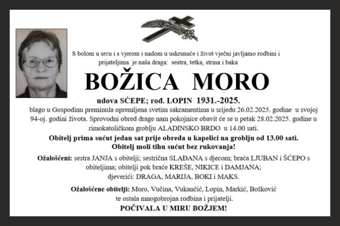 blago u Gospodinu preminula opremljena svetim sakramentima u srijedu 26.02.2025. godine u svojoj 94-oj. godini života. Sprovodni obred drage nam pokojnice obavit će se u petak 28.02.2025. godine u rimokatoličkom groblju ALADINSKO BRDO u 14.00 sati.