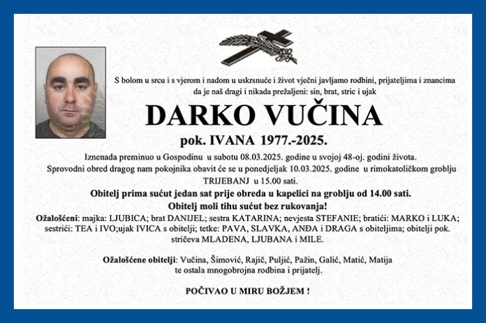 Sprovodni obred dragog nam pokojnika obavit će se u ponedjeljak, 10.03.2025. godine  u rimokatoličkom groblju TRIJEBANJ u 15.00 sati.