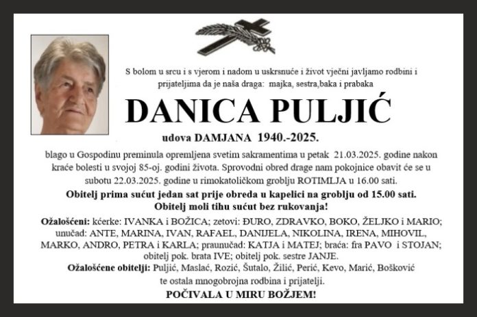 blago u Gospodinu preminula opremljena svetim sakramentima u petak 21.03.2025. godine nakon kraće bolesti u svojoj 85-oj. godini života. Sprovodni obred drage nam pokojnice obavit će se u subotu 22.03.2025. godine u rimokatoličkom groblju ROTIMLJA u 16.00 sati.