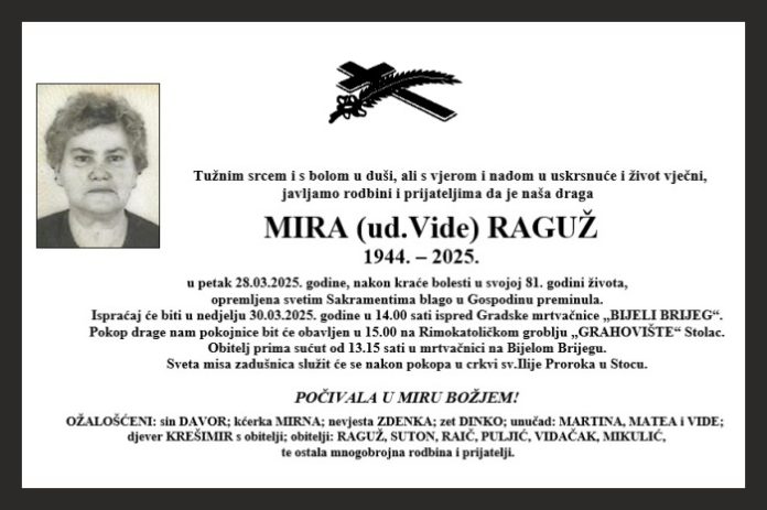 u petak 28.03.2025. godine, nakon kraće bolesti u svojoj 81. godini života, opremljena svetim Sakramentima blago u Gospodinu preminula. Ispraćaj će biti u nedjelju 30.03.2025. godine u 14.00 sati ispred Gradske mrtvačnice „BIJELI BRIJEG“.