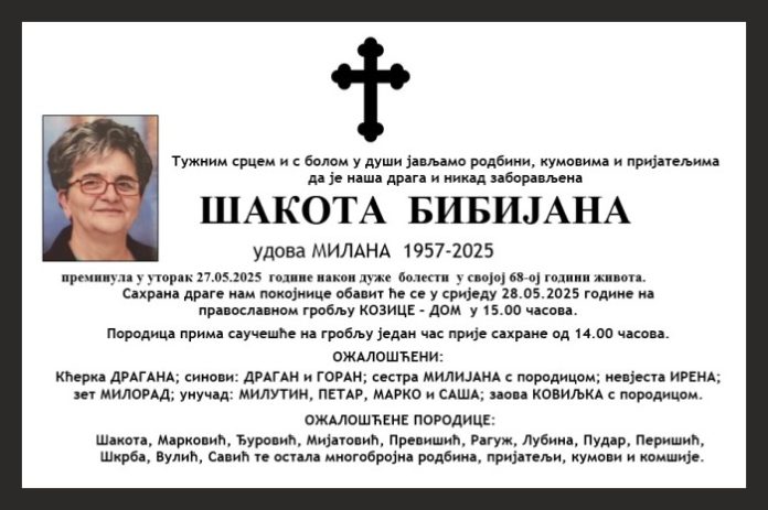 преминула у уторак 27.05.2025 године након дуже болести у својој 68-ој години живота. Сахрана драге нам покојнице обавит ће се у сриједу 28.05.2025 године на православном гробљу КОЗИЦЕ – ДОМ у 15.00 часова.