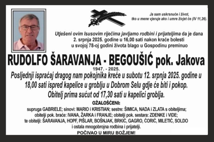 Utješeni ovim Isusovim riječima javljamo rodbini i prijateljima da je dana 2. srpnja 2025. godine u 16,00 sati nakon kraće bolesti u svojoj 78-oj godini života blago u Gospodinu preminuo