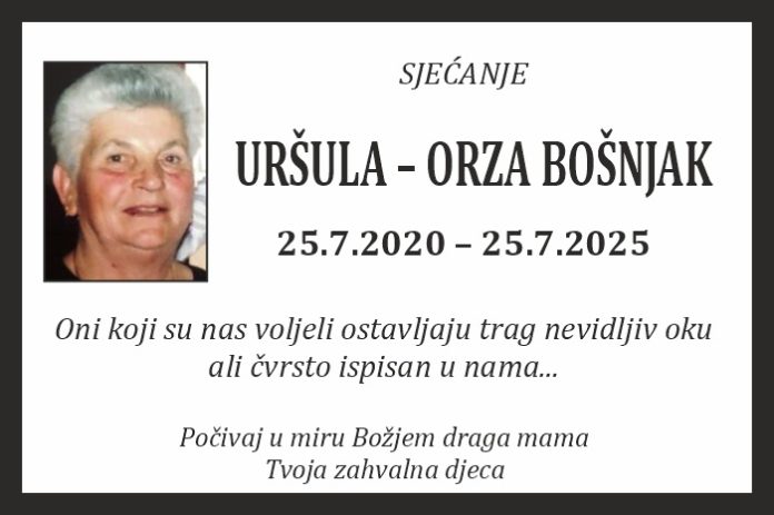 -Sjećanje- Uršula – Orza Bošnjak 25 srpnja, 2025 0 SJEĆANJE URŠULA – ORZA BOŠNJAK 25.7.2020 – 25.7.2025 Oni koji su nas voljeli ostavljaju trag nevidljiv oku ali čvrsto ispisan u nama… Počivaj u miru Božjem draga mama Tvoja zahvalna djeca