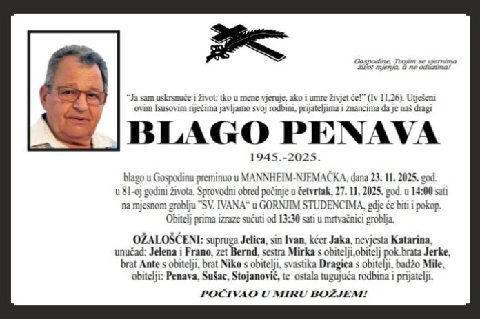 blago u Gospodinu preminuo u MANNHEIM-NJEMAČKA, dana 23. 11. 2025. god. u 81-oj godini života. Sprovodni obred počinje u četvrtak, 27. 11. 2025. god. u 14:00 sati na mjesnom groblju ”SV. IVANA“ u GORNJIM STUDENCIMA, gdje će biti i pokop.