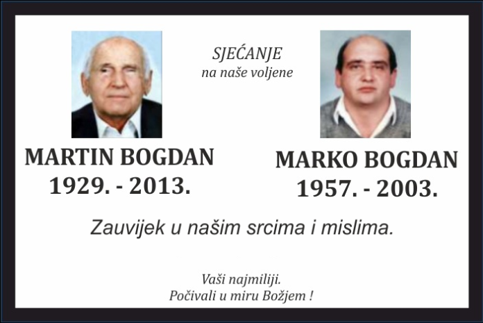 -Sjećanje-ČapljinaMetković Martin i Marko Bogdan 6 travnja, 2026 0 SJEĆANJE na naše voljene MARTIN BOGDAN 1929. – 2013. MARKO BOGDAN 1957. – 2003. Zauvijek u našim srcima i mislima. Vaši najmiliji. Počivali u miru Božjem !