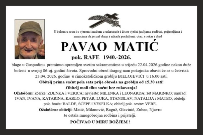 blago u Gospodinu preminuo opremljen svetim sakramentima u srijedu 22.04.2026.godine nakon duže bolesti u svojoj 86-oj. godini života. Sprovodni obred dragog nam pokojnika obavit će se u četvrtak 23.04. 2026. godine u rimokatoličkom groblju BJELOJEVIĆI u 16.00 sati.