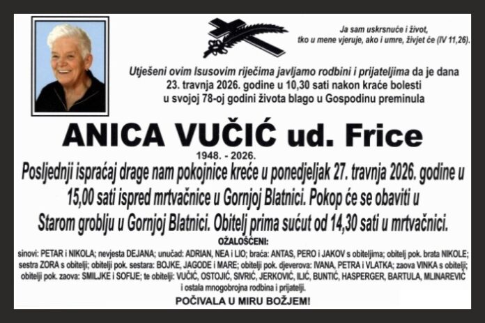 Utješeni ovim Isusovim riječima javljamo rodbini i prijateljima da je dana 23. travnja 2026. godine u 10,30 sati nakon kraće bolesti u svojoj 78-oj godini života blago u Gospodinu preminula