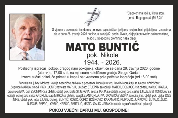 Posljednji ispraćaj i pokop, dragog nam pokojnika, obavit će se dana 28. travnja 2026. godine (utorak) u 17,00 sati, na mjesnom katoličkom groblju Struge-Gorica.