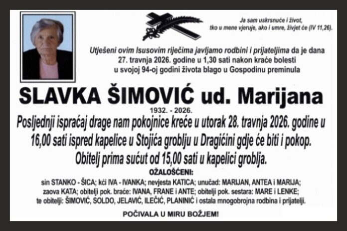 Utješeni ovim Isusovim riječima javljamo rodbini i prijateljima da je dana 27. travnja 2026. godine u 1,30 sati nakon kraće bolesti u svojoj 94-oj godini života blago u Gospodinu preminula