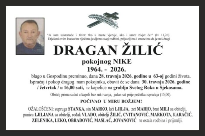 blago u Gospodinu preminuo, dana 28. travnja 2026. godine u 63-oj godini života. Ispraćaj i pokop dragog nam pokojnika, obavit će se dana 30. travnja 2026. godine / četvrtak / u 16,00 sati, iz kapelice na groblju Svetog Roka u Sjekosama.